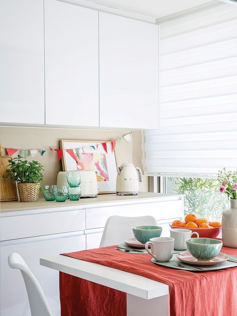 Optimizarea mobilierului principal pe o singura latura a permis si integrarea unei mici zone de luat masa; din dorinta de a spori zonele de depozitare, designerul a prevazut si pe aceasta latura a bucatariei doua dulapuri montate in partea superioara pentru a nu incarca vizual aceasta zona. Alegerea acelui rulou textil alb blocheaza lumina, dar fara a afecta luminozitatea camerei.