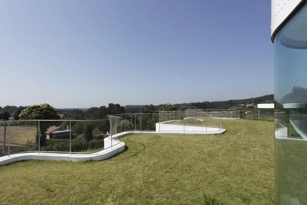 Acoperisul este singurul element care aduce o pata de culoare in constructia acestei case; este acoperit in intregime de gazon, fiind folosit ca spatiu pentru terasa, pentru momentele de reintalnire ale familiei in vacantele de vara.