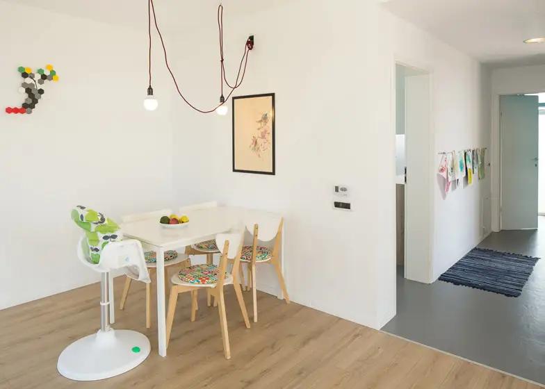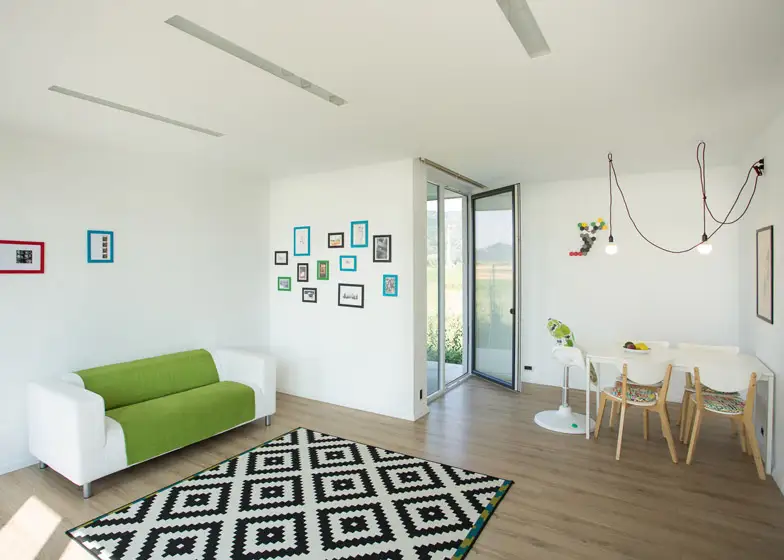 In interior, parterul compact include livingul, bucataria, o camera de utilitati si o baie. Decorul ne duce cu gandul la multifunctionalitatea stilului scandinav. Peretii albi, podea din lemn si pete de culoare transpuse in decoratiuni. Incalzirea se face prin pardoseala. La etaj intalnim mai multa culoare – verde, turcoaz si galben pentru a compensa calmul holului gri si a parterului.