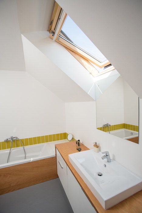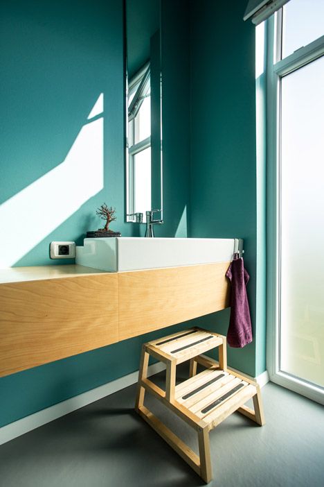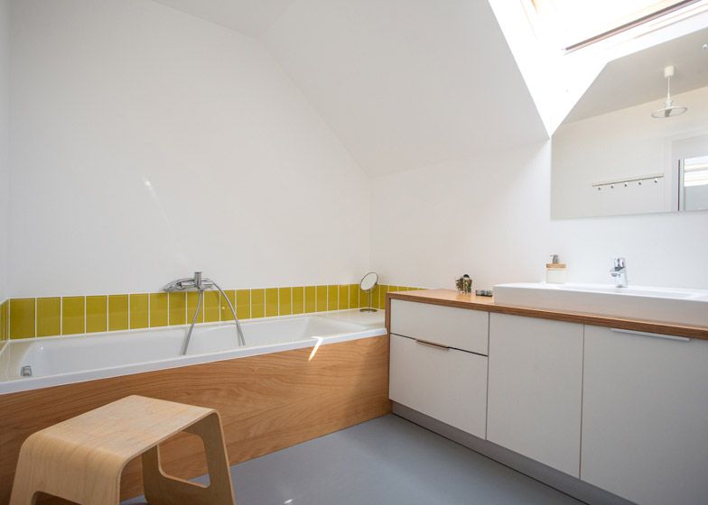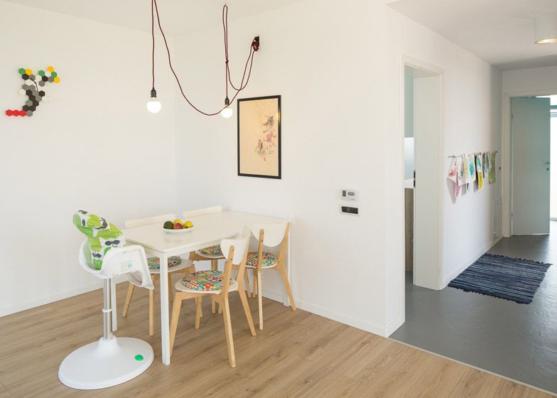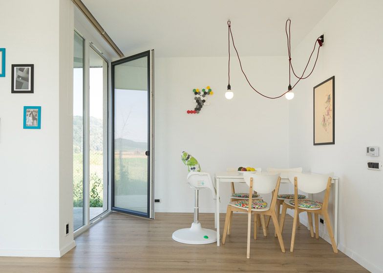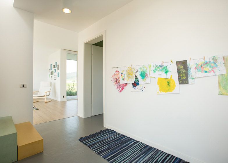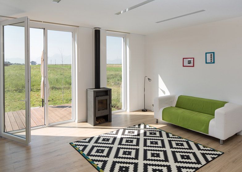 In interior, parterul compact include livingul, bucataria, o camera de utilitati si o baie. Decorul ne duce cu gandul la multifunctionalitatea stilului scandinav. Peretii albi, podea din lemn si pete de culoare transpuse in decoratiuni. Incalzirea se face prin pardoseala. La etaj intalnim mai multa culoare – verde, turcoaz si galben pentru a compensa calmul holului gri si a parterului.