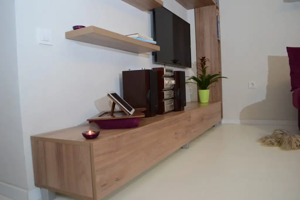 Un corp de mobilier aerisit, cu televizor suspendat si etajere care lasa spatiul sa respire. Albul si nuante de lemn se armonizeaza in aceasta combinatie
