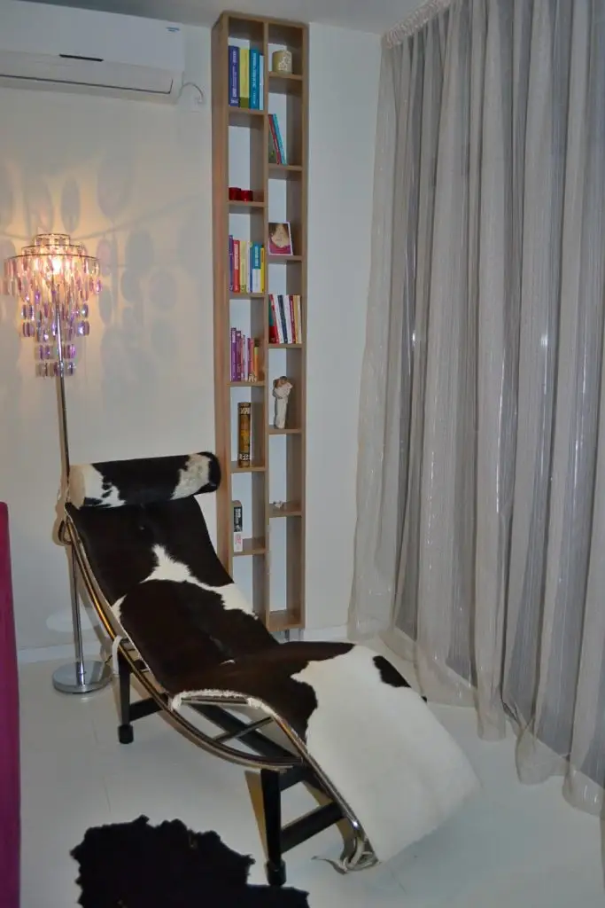Pentru ca ii place sa citeasca ori de cate ori are putin timp liber, si-a amenajat un colt de lectura cu o mini-biblioteca si un lounge din piele de vacuta foarte confortabil accesorizat cu o lampa in nuante pastelate de mov.