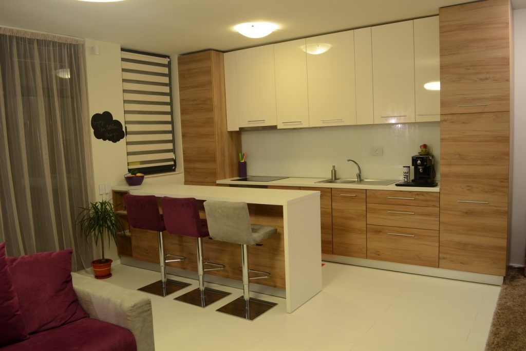 Am desenat singura schitele pieselor de mobilier, avand in permanenta in gand functionalitatea designului. Bucataria vine cu o unitate tip insula la care am adaugat 3 scaune de bar. Inaltimea nu este una standard (92cm), am dorit ca scaunele de bar sa le folosesc la inaltimea lor initiala.