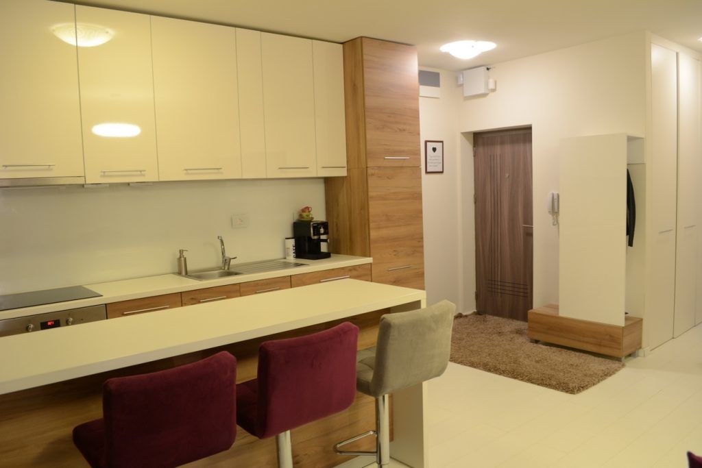 Mi-am dorit un apartament luminos, care ofera linii curate si elemente de design chic, precum si confortul unui camin primitor si modern care sa inspire prin cromatica. Pentru a crea iluzia unui spatiu mai mare, am optat pentru alb atat in alegerea parchetului si a usilor, cat si pentru mobila. Peretele din living care are iesire catre terasa este din sticla, oferind astfel o luminozitate mare.