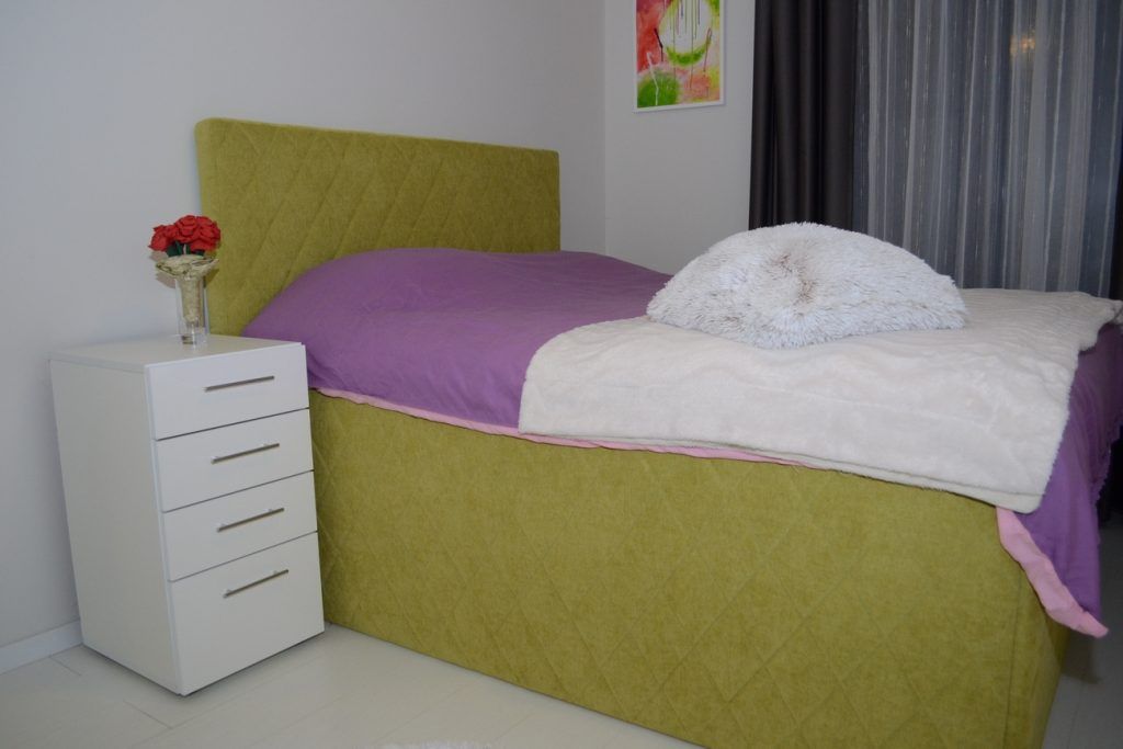 Pentru dormitor mi-am dorit un spatiu confortabil, modern si cu adevarat relaxant pastrand pentru parchet, dulap si noptiera acelasi alb, iar ca element de accent am folosit verdele crud la tapiteria patului, ce se combina perfect cu griul draperiei si cu tabloul care imbraca frumos peretele (este realizat de mine).