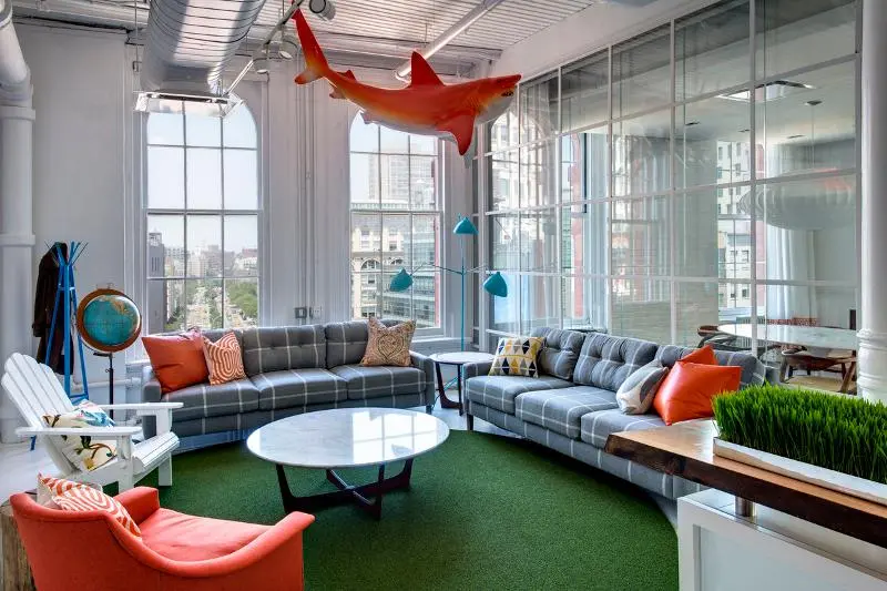 Aceste amenajari absolut adorabile sunt birourile unor agentii de publicitate sau de avocatura, iar un asemenea decor este cea mai buna carte de vizita pentru cei care vin in vizita. Un rechin portocaliu care atarna din tavan? Da! Eu unul m-as intoarce cu placere intr-un asemenea birou.
