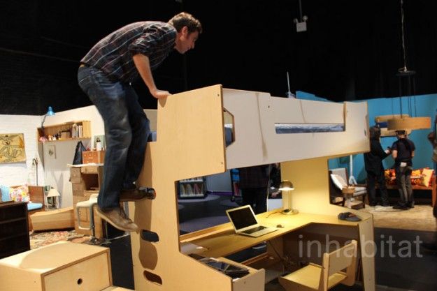 Acest patut pentru bebelusi se transforma, odata ce copilul a crescut si nu mai are nevoie de el, intr-un pat supraetajat cu birou, in doua paturi supraetajate sau intr-un pat supraetajat cu mai multe spatii de depozitare in scarile aflate in aceasta piesa inedita de mobilier.