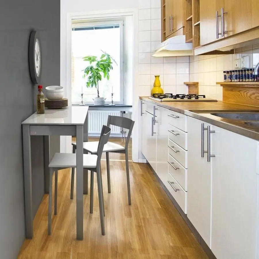 Nu doar forma conteaza, ci si marimea mesei. Pentru ca vorbim de bucatarii mici, si modelul ar trebui sa fie adaptat spatiului; patrata sau dreptunghiulara, important este sa urmeze linia amenajarii si sa nu incurce circulatiile in bucatarie.