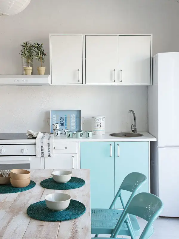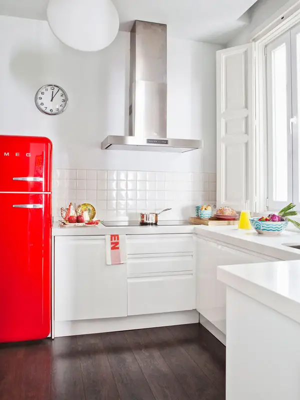 Bucatarie amenajata in spirit retro cu frigider colorat din gama SMEG