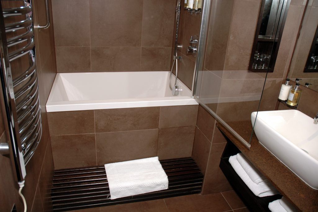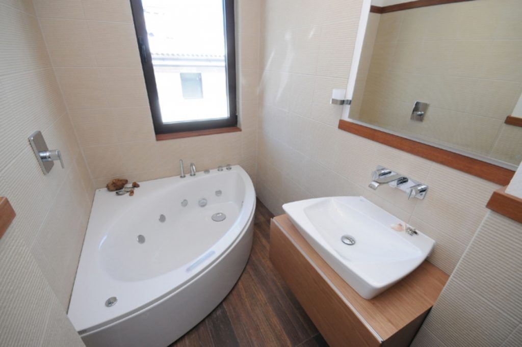 Un spatiu de mici dimensiuni, eficientizat cu ajutorul unei cazi pe colt. Aceasta ofera un aer luxos incaperii si o face sa para mai mare decat este in realitate.