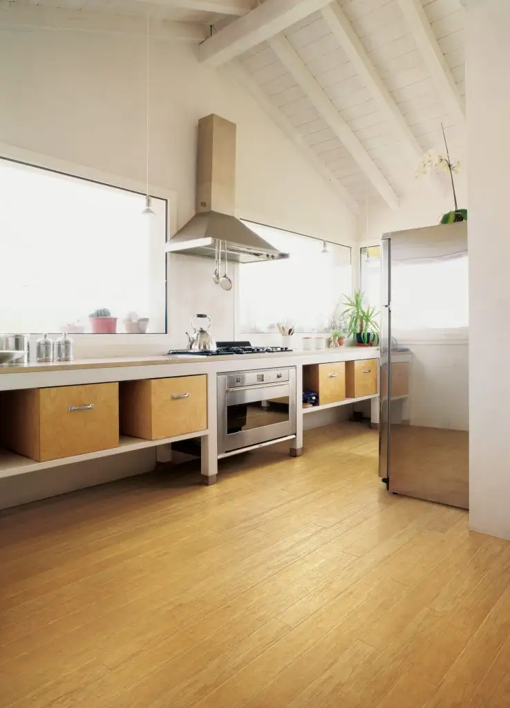 Lemnul cu aspect nefinisat este foarte frumos si cu siguranta atrage atentia, insa in bucatarie este bine sa optati pentru placi lungi de lemn, scanduri, netede si fara denivelari de niciun tip pentru ca firmiturile si resturile pot intra in orificii si curatarea podelei devine foarte dificila. De regula un strat de lac va ajuta si el la mentinerea pardoselii netede si usor de intretinut.