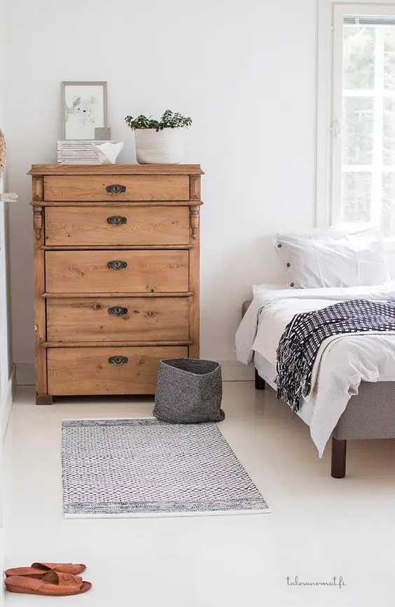 In acest dormitor, este clar ca lemnul este cel care da tonul. Comoda cu mai multe rafturi reprezinta un loc de depozitare extraordinar.