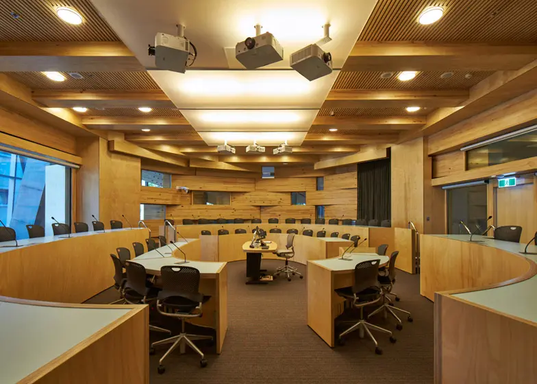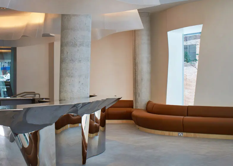 Fatada ondulata a cladirii are o textura sub forma de caramida neslefuita, aceasta contrasteaza cu ferestrele care oglindesc cerul si celelate cladiri din jur, care dau o senzatie de tri-dimensional.