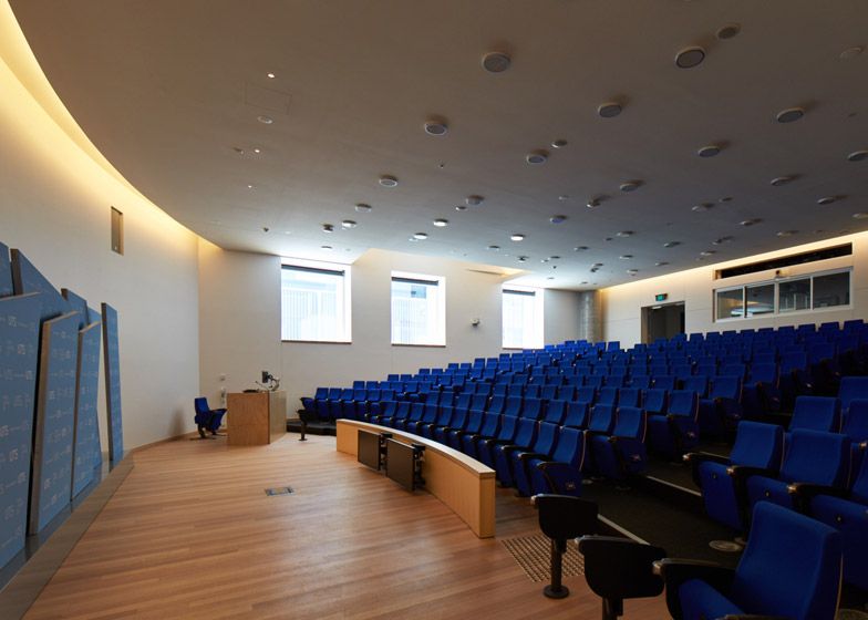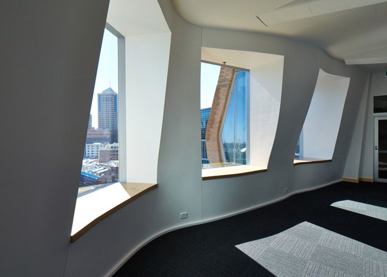 Fatada ondulata a cladirii are o textura sub forma de caramida neslefuita, aceasta contrasteaza cu ferestrele care oglindesc cerul si celelate cladiri din jur, care dau o senzatie de tri-dimensional.