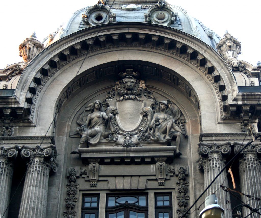 Totusi, ceea ce impresioneaza cel mai mult, fiind si cel mai interesant detaliu al constructiei, este frontonul, alaturi de grupul sau statuar, reprezentand industria cu ciocanul in mana, in stanga, si zeul Mercur, in dreapta, tinand caduceul intr-o mana, iar in alta o ancora.