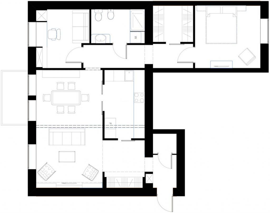 Pentru a mari spatiul zonei de zi, a fost redus din spatiul holului, iar bucataria mutata in perimetrul nou creat (liniile punctate din schita apartamentului arata modificarile realizate la nivelul partitiilor). Beneficiarei ii place sa gateasca, de accea a dorit o bucatarie inchisa. In continuarea ei, se afla zona de luat masa cu 6 locuri (poate fi extinsa).