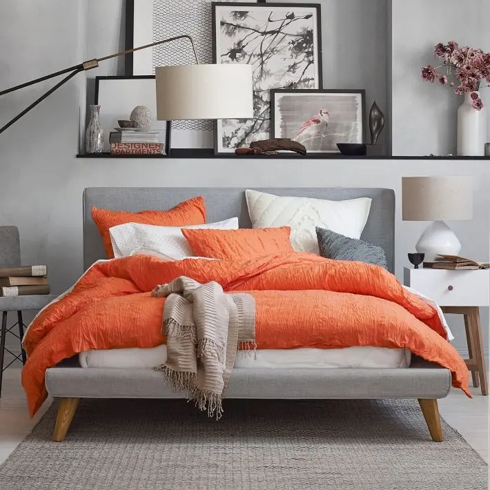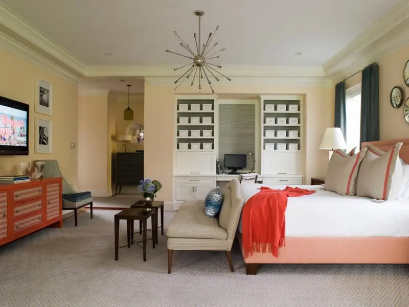 Dormitor cu elemente de culori calde de piersica si coral