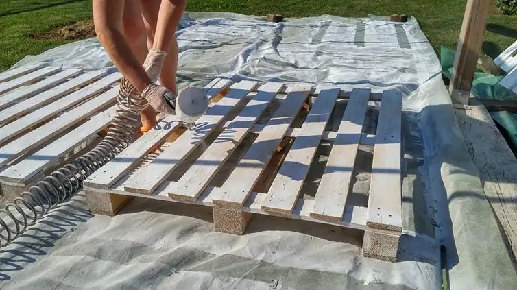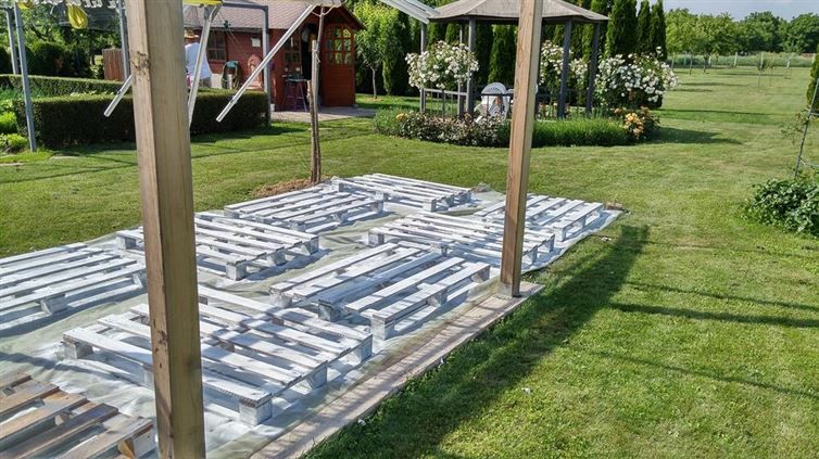 Dupa ce paletii s-au uscat stabiliti zona unde vreti sa va amenajati locul de relaxare si incepeti sa asezati paletii peste covorul geotextil.