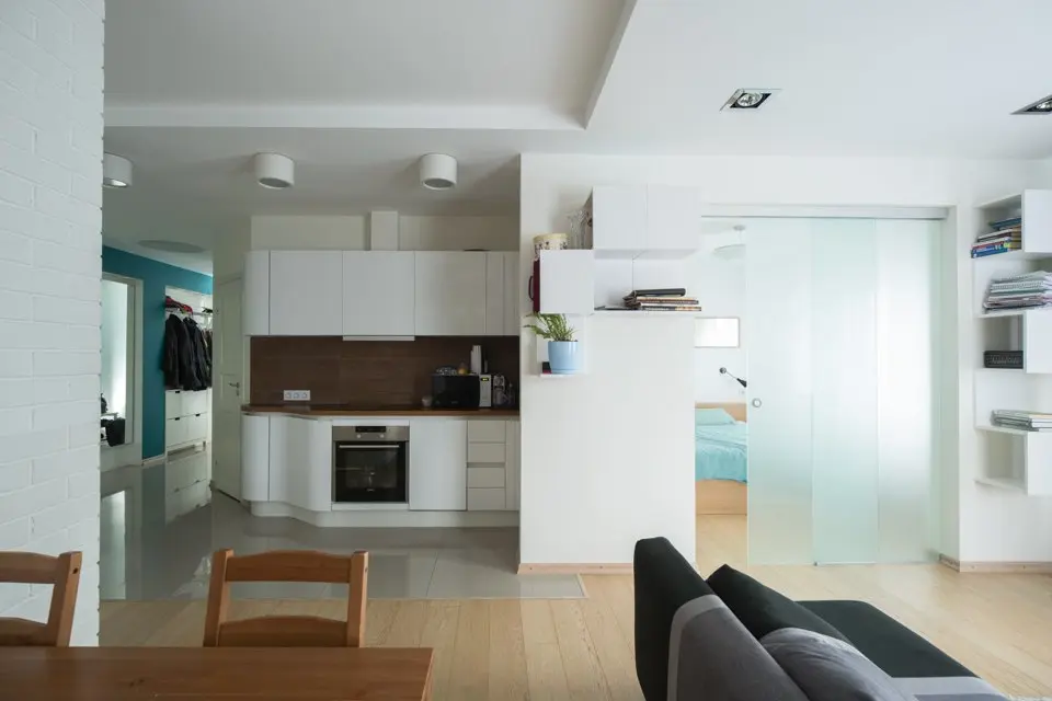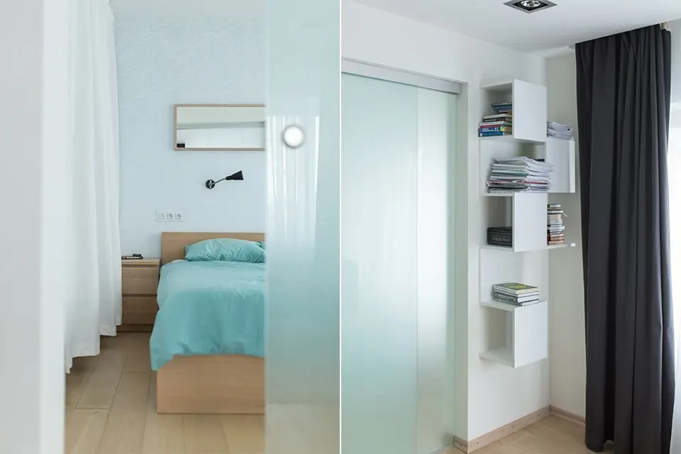 Din living se intra in dormitorul matrimonial (fosta bucatarie), care, in mod interesant, este separat printr-o usa din sticla semi-transparenta, astfel camera de zi primind mai multa lumina naturala sporind senzatia de spatialitate.