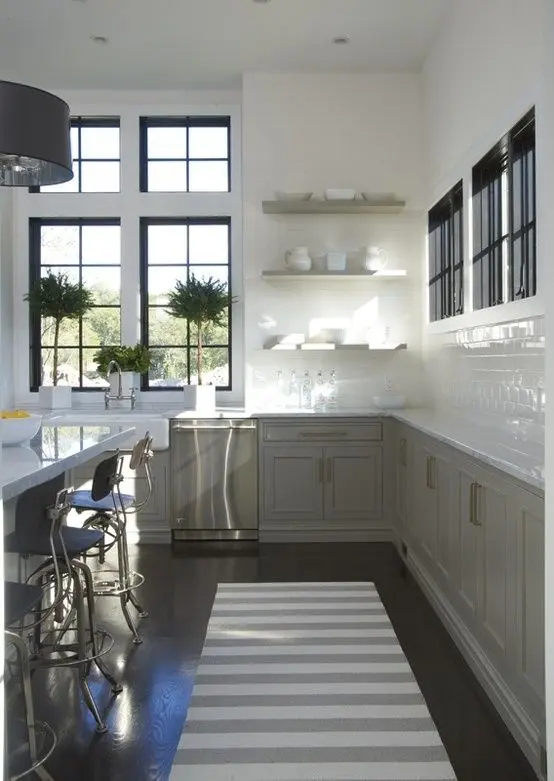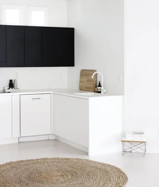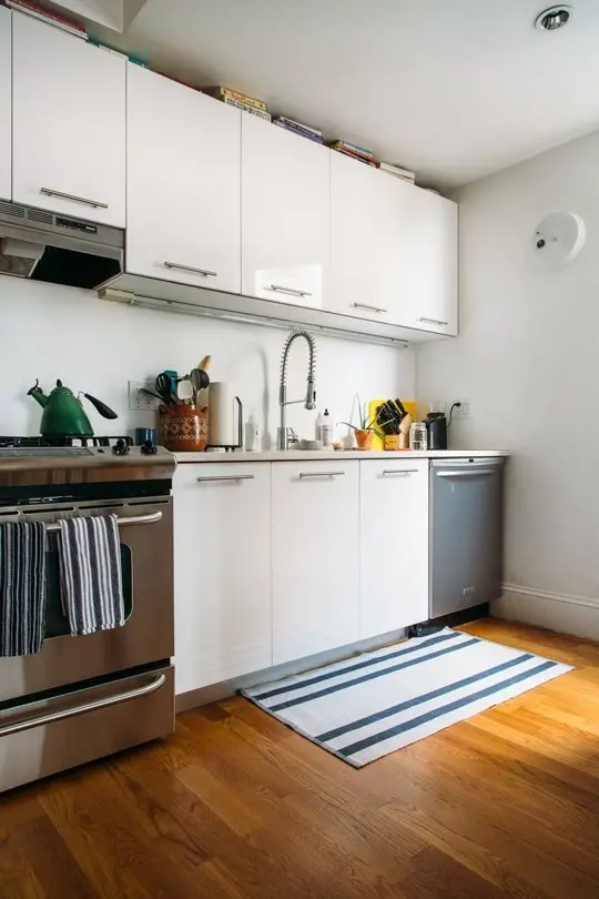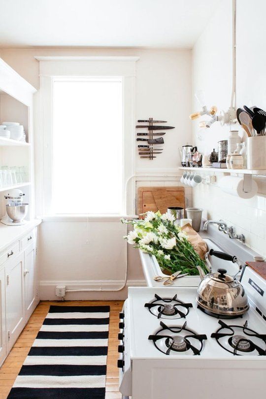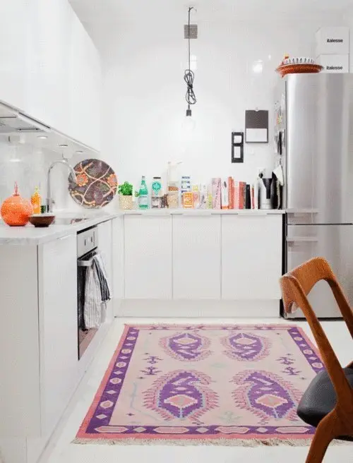 Daca amenajarea bucatariei este preponderent alba, atunci un covoras sau carpeta in dungi colorate ar putea fi solutia pentru a dinamiza decorul si a-l face mai vesel.