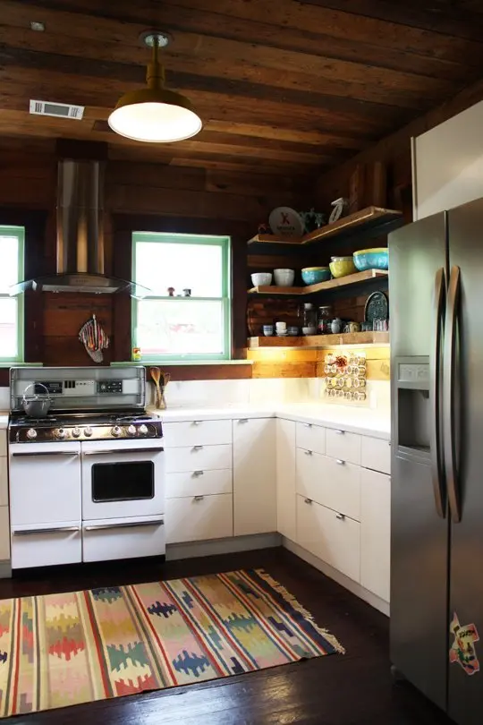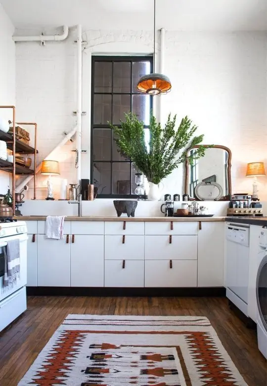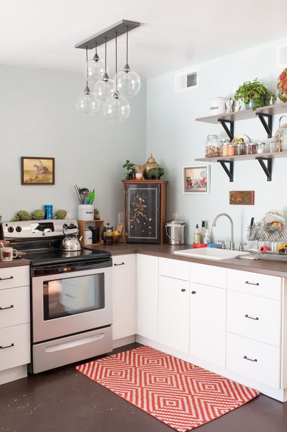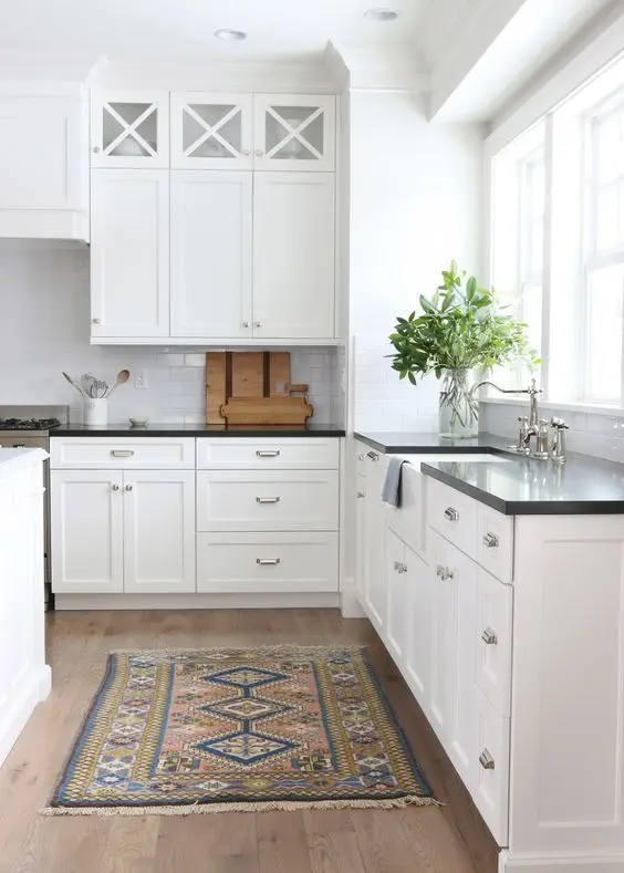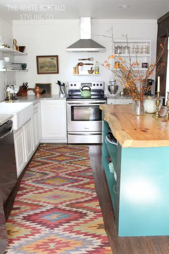 In plus, printr-un covor poti masca o pardoseala inestetica. Intr-o bucatarie lunga si ingusta, se poate aseza o traversa colorata pe toata lungimea bucatariei. O astfel de abordare te ajuta sa creezi impresia unui spatiu mai larg cu conditia ca respectivul covor sa nu acopere intreaga suprafata a pardoselii.