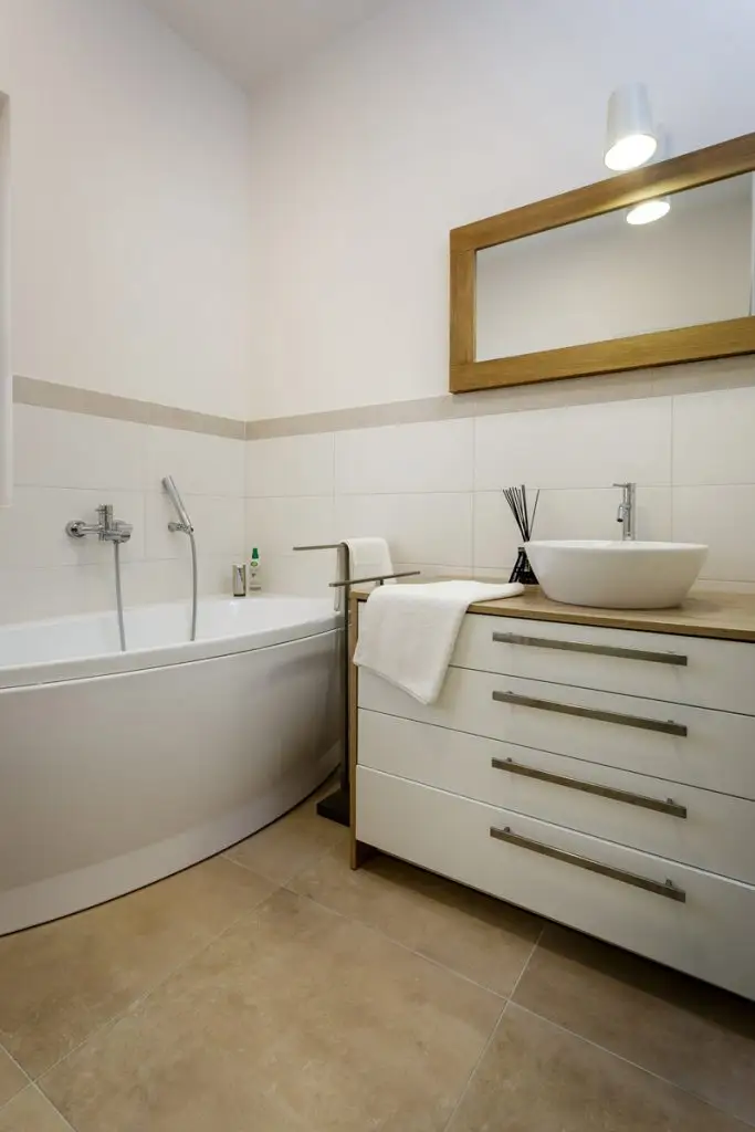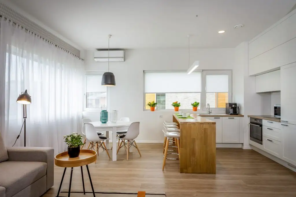 Predomina o cromatica neutra, cu texturi de lemn si mult alb care impreuna contureaza o atmosfera calda si placuta, mai ales in contextul ferestrelor generoase ce permit o cantitate mare de lumina naturala.