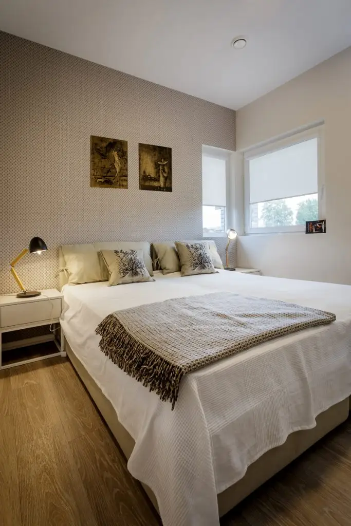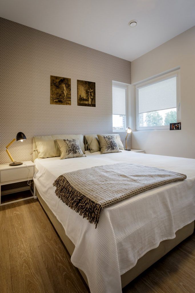 Si in dormitor se pastreaza aceeasi linie a designului, camera capatand un aer relaxant si reconfortant gratie tapetului puternic texturat, al esentei de lemn de la nivelul pardoselii, dar si al lenjeriei ce intregeste stilistic compozitia.