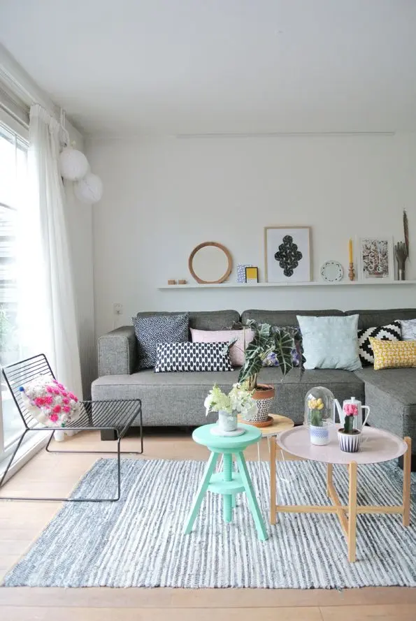 Tonurile de pastel si griuri coloreaza placut acest living