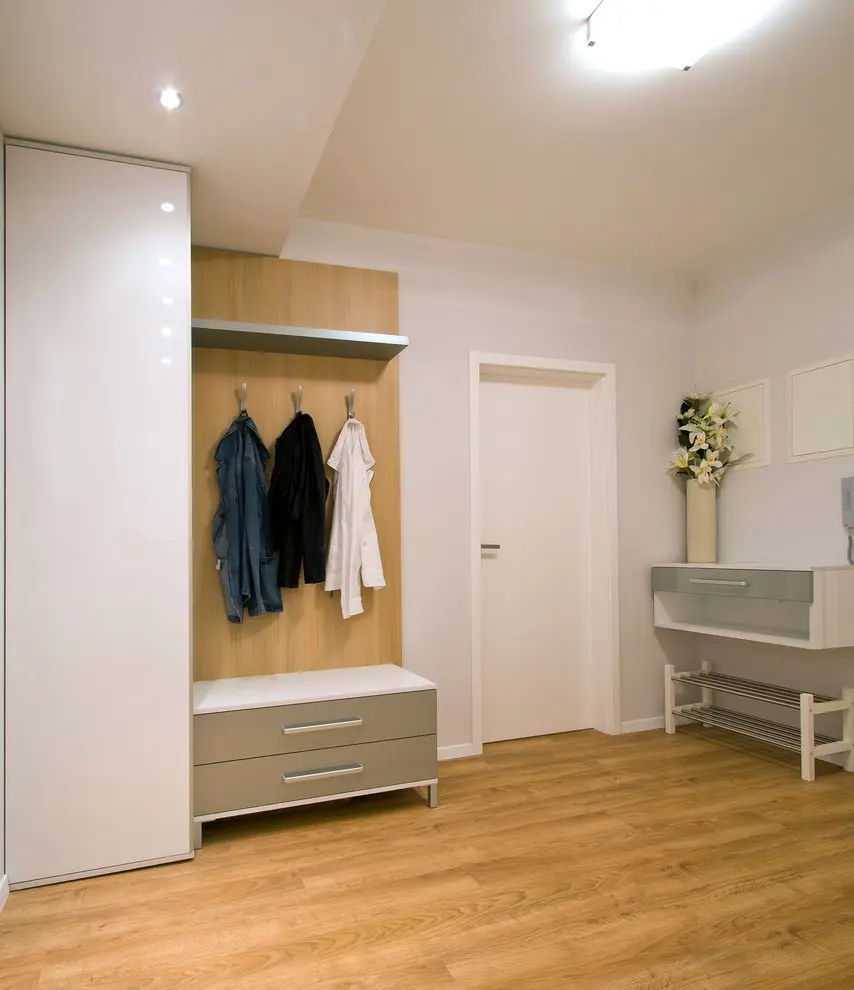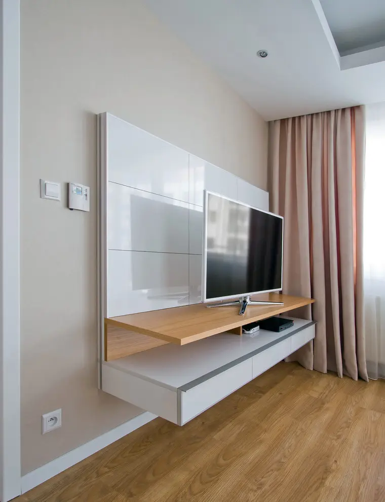 Din punct de vedere cromatic predomina albul si cremul, precum si culoarea lemnului de la nivelul pardoselii. Astfel, camera pare mai luminoasa si mai spatioasa. S-a optat pentru o mobilare sumara, concentrata pe piesele care redau functiunea respectiva.
