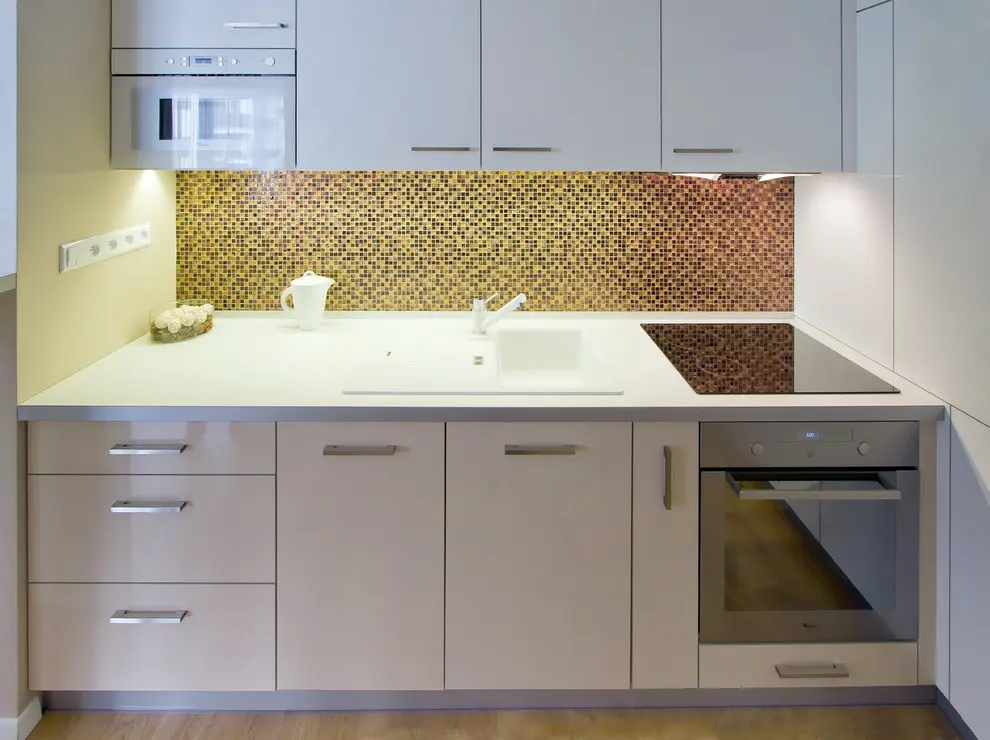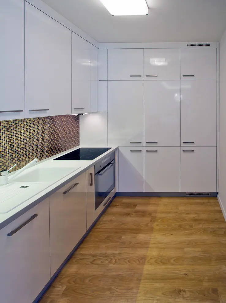 Pentru mobilarea bucatariei s-a mizat pe finisaje asemanatoare utilizate in living. S-a folosit M DF alb, lucios pentru a pastra continuitatea amenajarii. Bucataria este compacta, cu un design simplu, ordonat.Toate electrocasnicele au fost incorporate in mobilier sporind caracterul unitar al incaperii. Zona de luat masa face o trecere discreta intre cele functiuni.