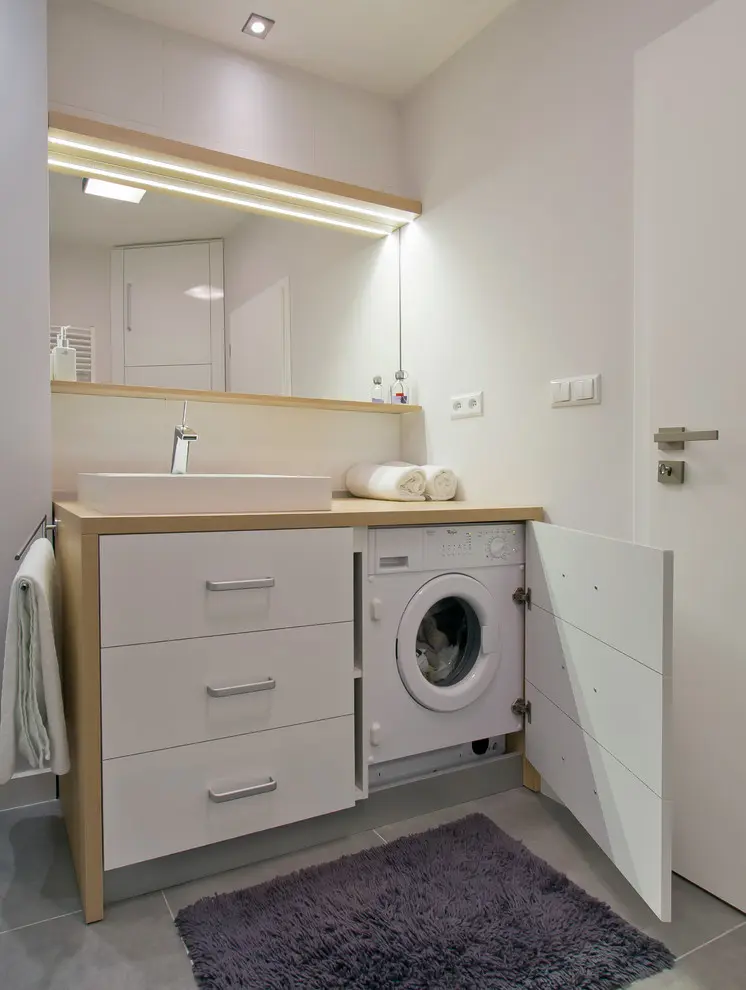Si in baie, s-a urmarit o abordare functionala cu spatii de depozitare variate. Avem astfel incastrata masina de spalat rufe intr-un corp lung ce are incorporat si lavoarul. Partea superioara include dulapuri acoperite de oglinzi, iar benzile L ED ofera un iluminat ambiental placut.