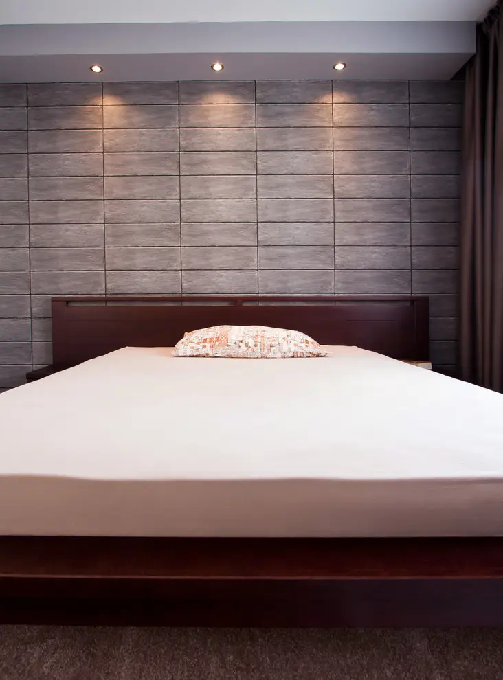 Aceeasi abordare minimala o vom regasi si in dormitor. Decorul este elegant amenajat, fara a omite nicio clipa functionalitatea. Desi spatiul este mic, amenajarea asigura confortul necesar, fara a aglomera incaperea. Patul este piesa centrala, cu un perete-accent texturat menit sa aduca un plus de stil incaperii. Tot aici a fost integrata si principala zona de depozitare a locuintei vezi dressingul amenajat pe lungimea peretilor.