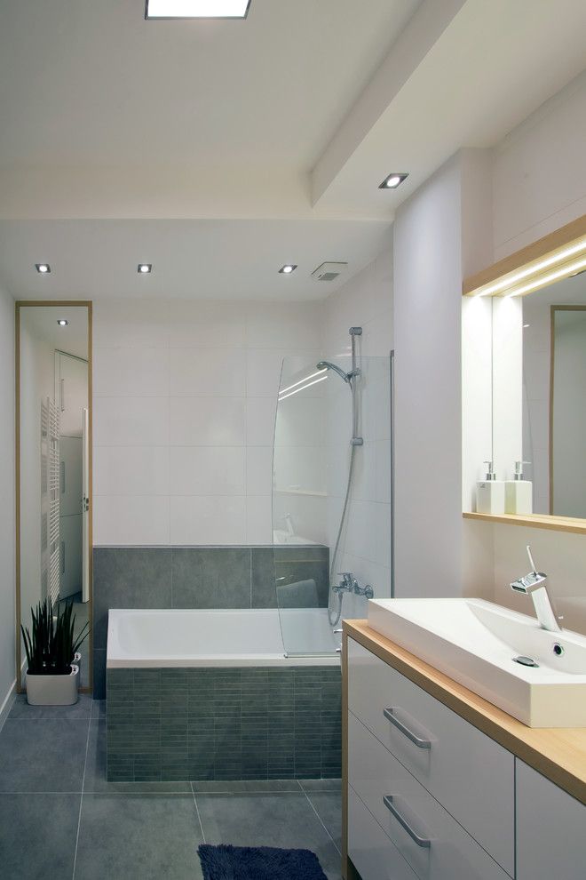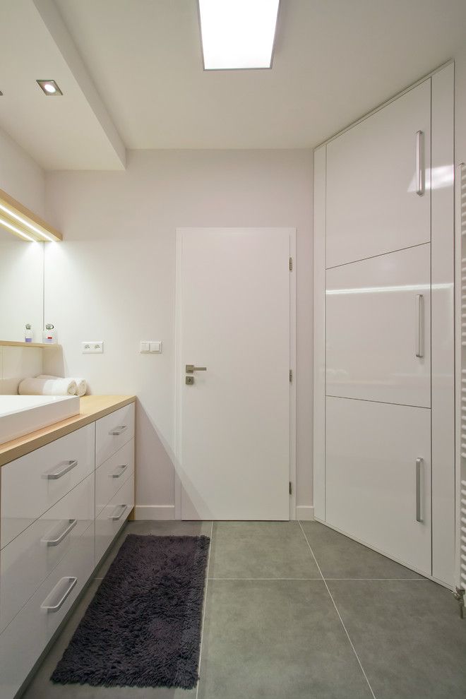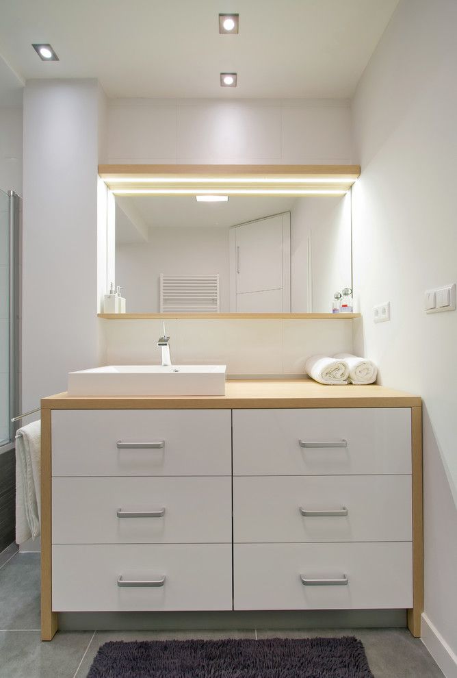 Si in baie, s-a urmarit o abordare functionala cu spatii de depozitare variate. Avem astfel incastrata masina de spalat rufe intr-un corp lung ce are incorporat si lavoarul. Partea superioara include dulapuri acoperite de oglinzi, iar benzile L ED ofera un iluminat ambiental placut.