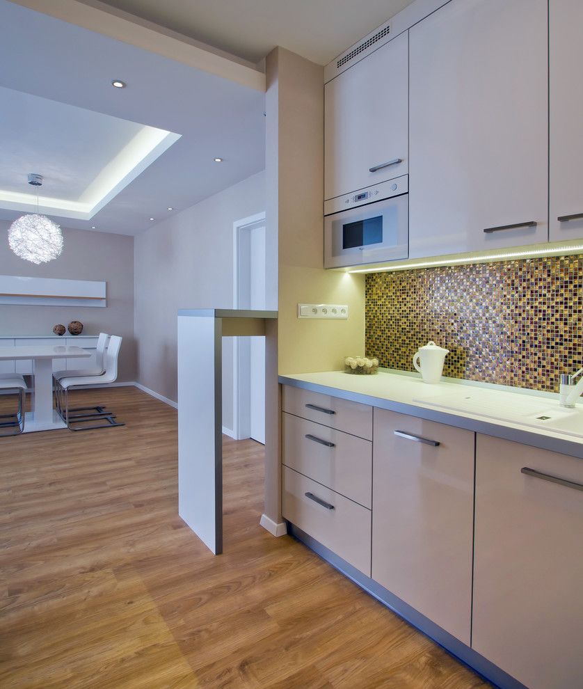 Pentru mobilarea bucatariei s-a mizat pe finisaje asemanatoare utilizate in living. S-a folosit M DF alb, lucios pentru a pastra continuitatea amenajarii. Bucataria este compacta, cu un design simplu, ordonat.Toate electrocasnicele au fost incorporate in mobilier sporind caracterul unitar al incaperii. Zona de luat masa face o trecere discreta intre cele functiuni.