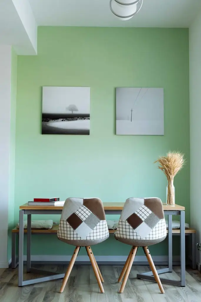 In cateva zone ale casei am inserat accente de culoare in contrast cu mobilierul: verde pe hol si in living, bej in dormitorul matrimonial.