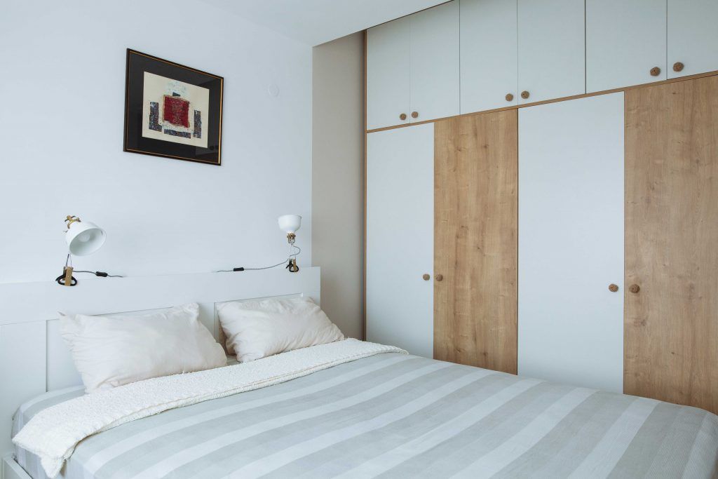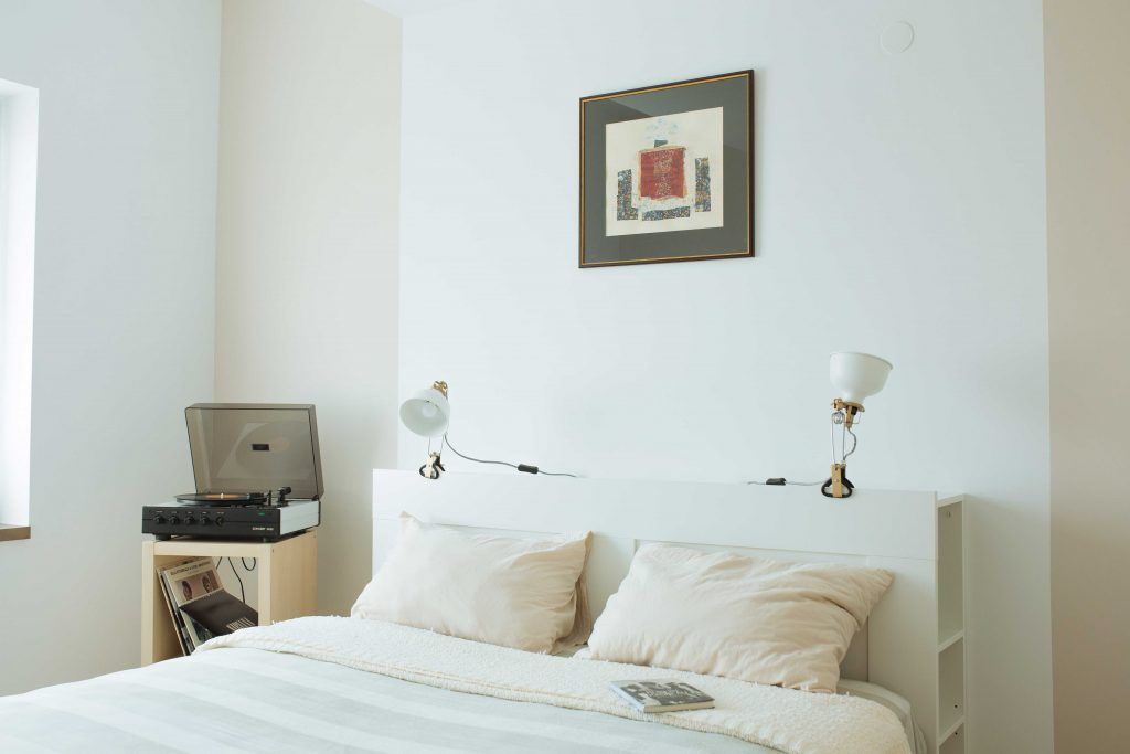 Dormitorul matrimonial imbina perfect culorile deschise si texturile calde cu tablourile, iar pick-up-ul parca te transpune in lumi boeme.