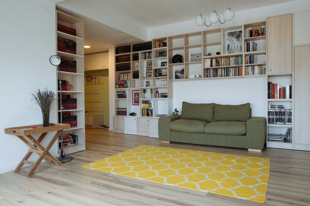 Apartamentul, cu o suprafata de 73 metri patrati, este situat aproape de centrul orasului cu o priveliste frumoasa asupra Bucurestiului. Calin, impreuna cu familia sa, a dorit ca noua locuinta sa fie una calda, aerisita si luminoasa, neaparat cu biblioteca cat mai mare, cu o zona de dining cu bancuta si masa si cu o bucatarie bine organizata.