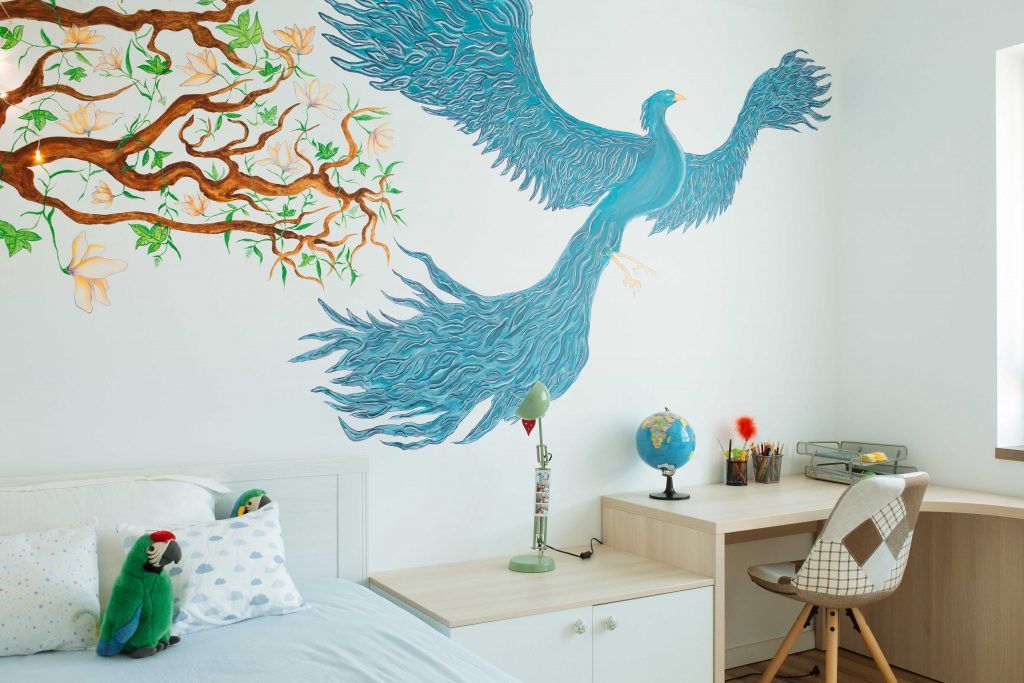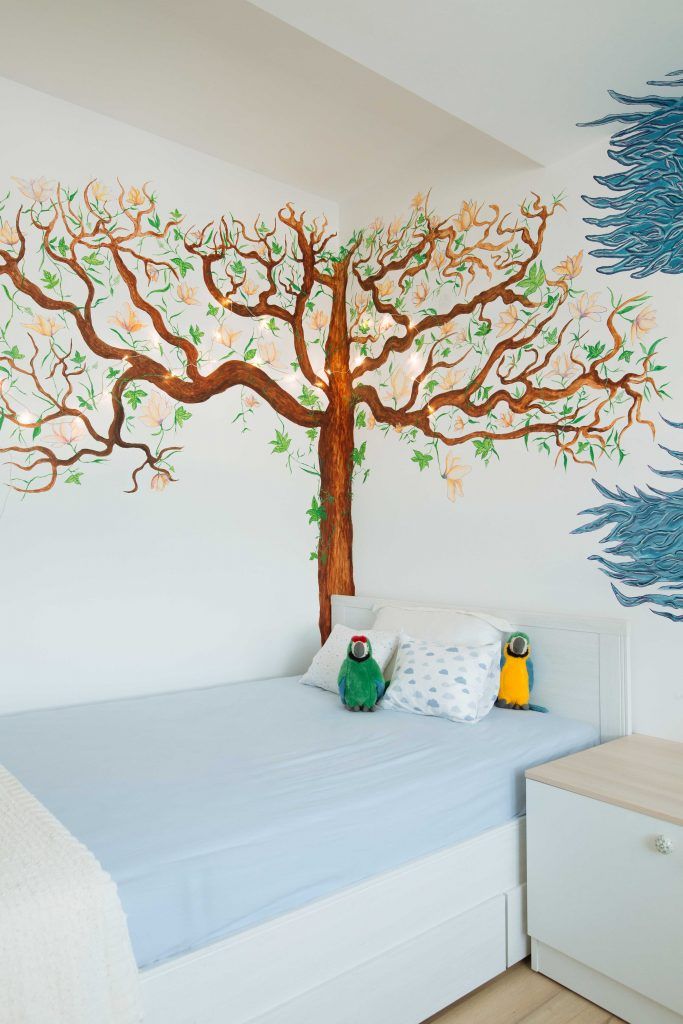 Fetita este pasionata de pasari, de aici si desenul de pe pereti realizat de un prieten al familiei in camera acesteia. Finisajele deschise, culorile si designul obiectelor de mobilier, impreuna cu lumina naturala, creeaza un spatiu dinamic, dar primitor si relaxant in acelasi timp.