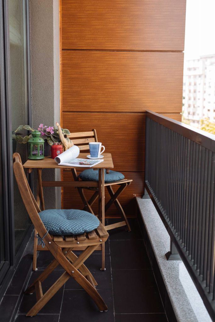Balconul a fost amenajat si el ca o zona de savurat cafeaua dimineata sau de admirat apusul la ceas de seara: doua scaune si o masa din lemn alaturi de mici decoratiuni.