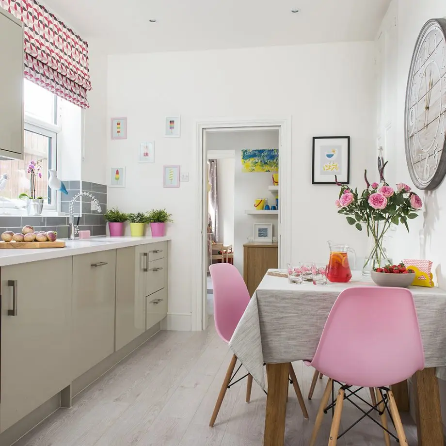 Pentru a contura noua bucatarie, au facut modificari in hol, largind astfel spatiul pentru gatit. Acum, bucataria este mai luminoasa si mai usor de folosit, cu piese de mobilier dispuse liniar, iar masa asezata la perete (este extensibila). Schema de culori este neutra, cu tuse de roz si decoratiuni care anima atmosfera bucatariei si reduc din caracterul tehnic al acestei functiuni.