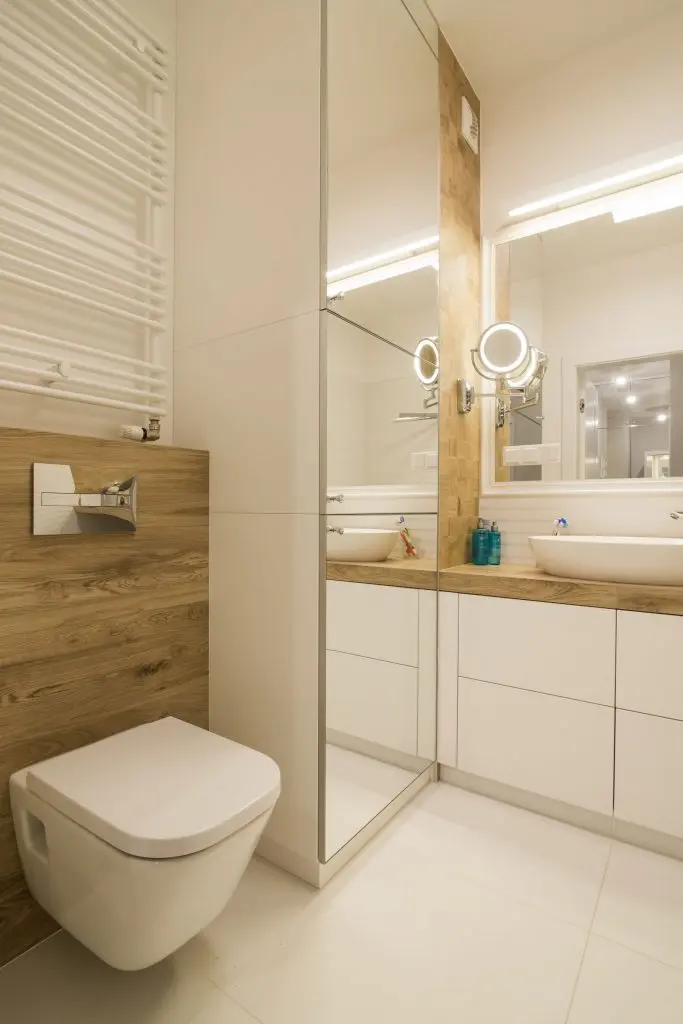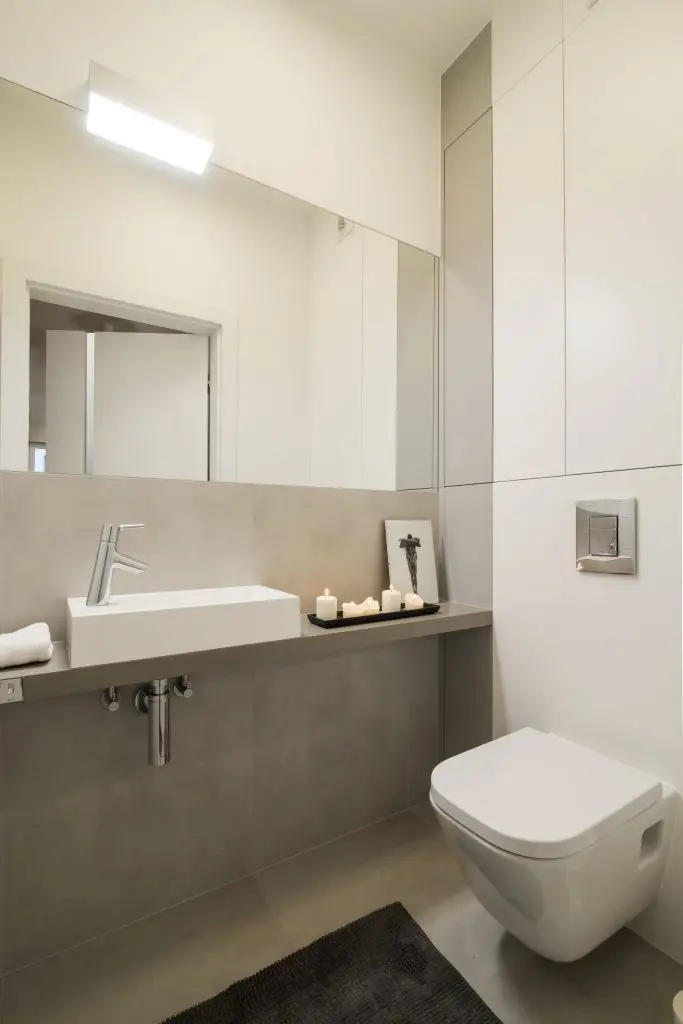 Cele doua bai prezentate se imbina simetric fiecare evidentiind un stil propriu dar compatibil celeilalte. Intr-una din aceste incaperi intalnim ca accent lemnul natural, iar in cea de a doua gri-ul. Ambele exprima un aer modern atat prin elementele ce le compun, cat si prin accesorii.