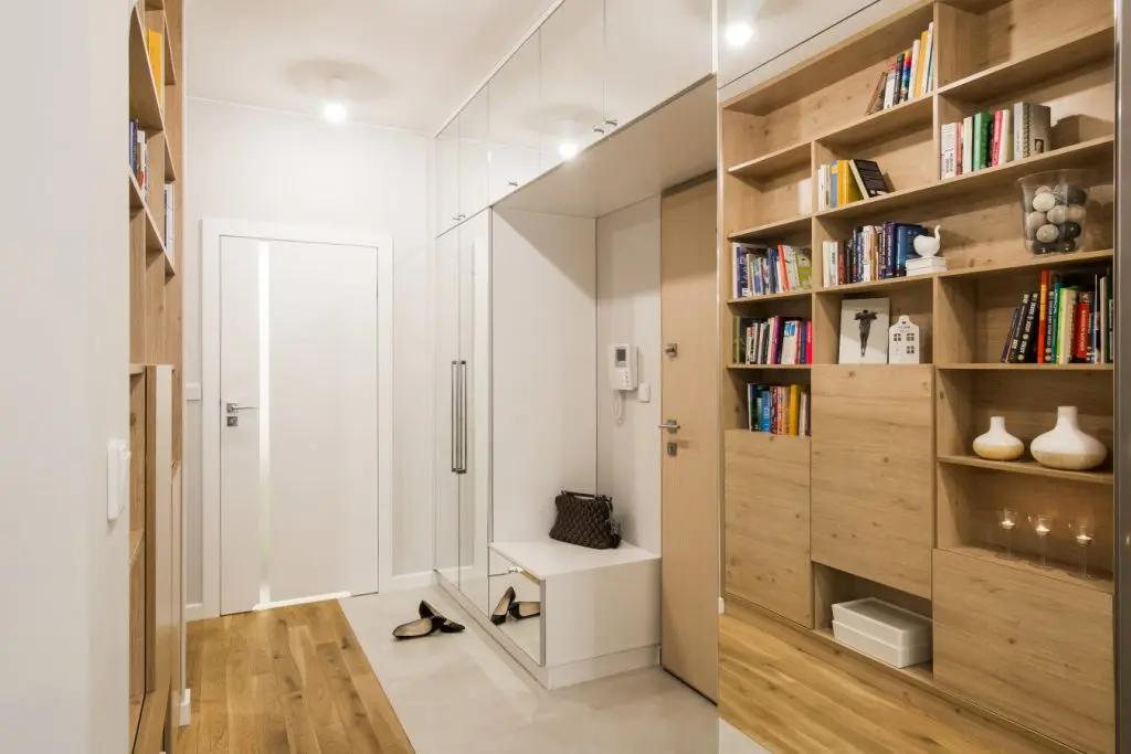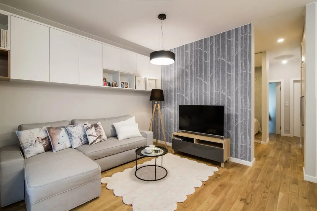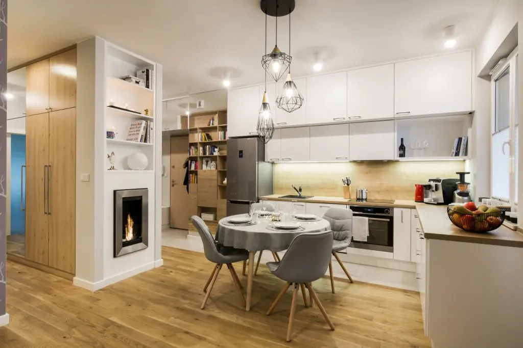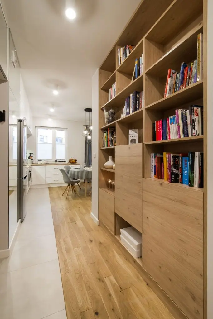 Open space-ul de mari dimensiuni incorporeaza bucataria si living-ul si pune central un perete cu doua roluri diferite: biblioteca si dressing. Mobilierul minimalist impreuna cu coltarul extensibil, covorul si masa de cafea moderne, sunt scoase din anonimat de peretele tapetat cu texturi tridimiensionale.