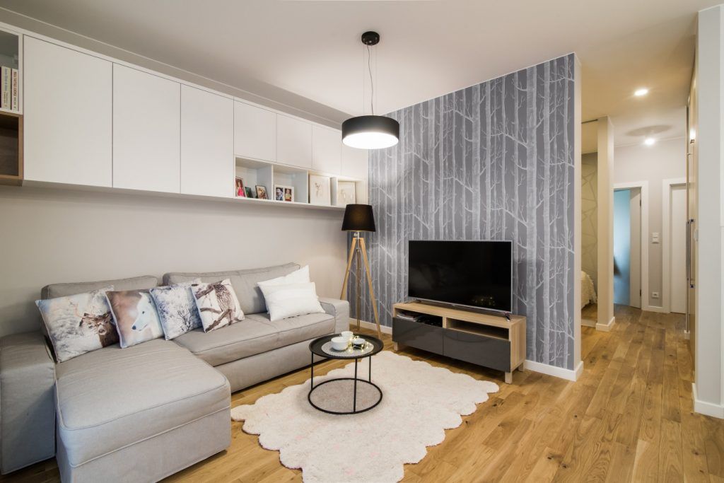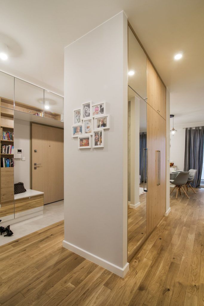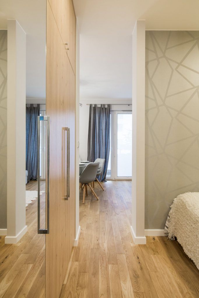 Accentele sunt date de nuantele de alb, gri si lemn natural, prezente in fiecare din camerele apartamentului. Delimitarea spatiilor se face subtil, doar prin pereti despartitori, asemenea unul labirint omogen. Texturile sunt de diferite feluri: geometrice, liniare, naturale si le putem intalni in compozitia tapetului, gresiei, faiantei si parchetului.