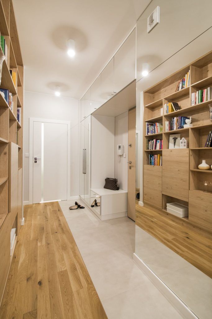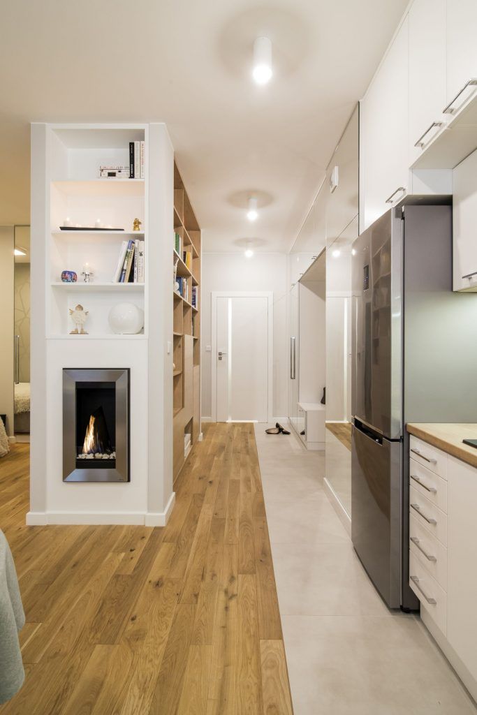 Open space-ul de mari dimensiuni incorporeaza bucataria si living-ul si pune central un perete cu doua roluri diferite: biblioteca si dressing. Mobilierul minimalist impreuna cu coltarul extensibil, covorul si masa de cafea moderne, sunt scoase din anonimat de peretele tapetat cu texturi tridimiensionale.