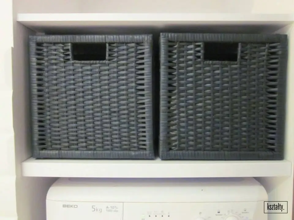 Interesant este felul cum a fost puse in valoare tevile aferente centralei. Desi ne-am fi asteptat sa se incerce o mascare a lor, designerul a ales sa le vopseasca in negru, transformandu-le intr-un soi de punct de interes al baii. Pe fundalul alb, accentele de negru reusesc sa iti atrag atentia realizand o coeziune cu celelalte elemente de negru pe care le regasim in decorul baii. Ne place si modul cum a fost amenajat spatiul cu masina de spalat rufe: practic si eficient cu rafturi si dulap pentru o depozitare ordonata.