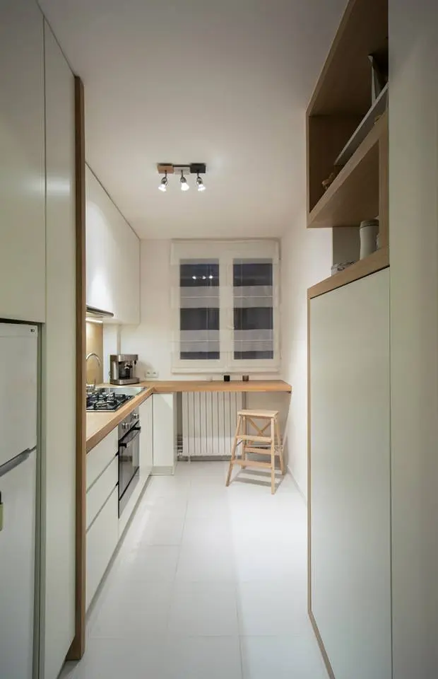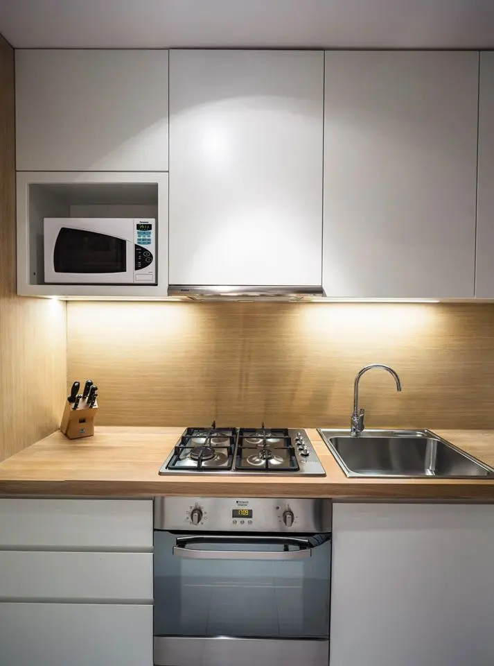 Toate electrocasnicele sunt incorporate in mobilier. In plus, la intrarea in bucatarie au fost amenajate 2 nise pentru a adaposti spatii de depozitare generoase. In acelasi scop, toate corpurile de mobilier sunt inalte pana in tavan, maximizand fiecare metru patrat disponibil.