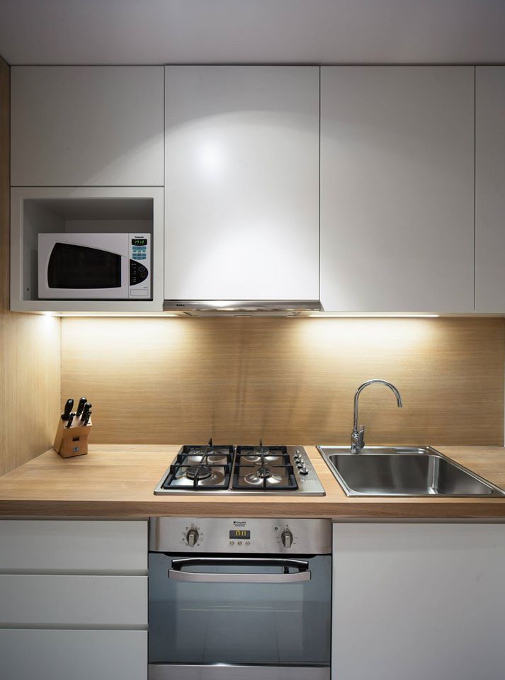 Toate electrocasnicele sunt incorporate in mobilier. In plus, la intrarea in bucatarie au fost amenajate 2 nise pentru a adaposti spatii de depozitare generoase. In acelasi scop, toate corpurile de mobilier sunt inalte pana in tavan, maximizand fiecare metru patrat disponibil.