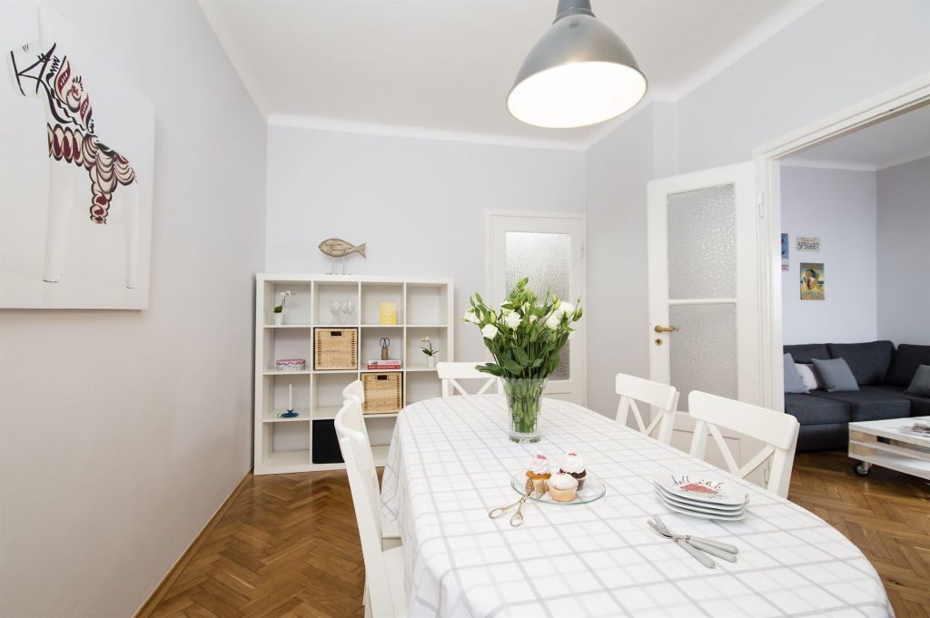 Vorbim despre un apartament de 2 camere, cu o suprafata totala de 68 metri patrati, cu o zona de zi generoasa, avand un loc pentru dining bine definit. Parchetul a fost pastrat, fiind intr-o stare buna (recent reconditionat). De asemenea, peretii au fost zugraviti folosind o nuanta deschisa care sa sporeasca luminozitatea in incapere.