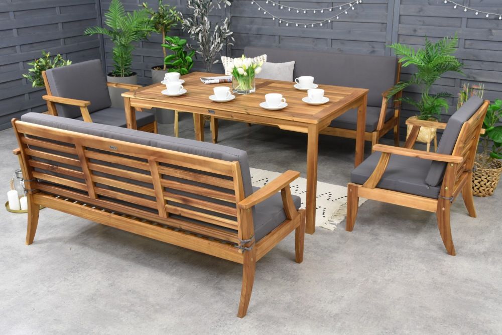 Mobilierul de grădină din lemn este atemporal și oferă o notă naturală și rustică spațiului exterior. Se schimbă în timp, dezvoltând o patină atrăgătoare. Lemnul este apreciat pentru frumusețea sa și rezistența la uzură. Un set din lemn de salcâm are nevoie de o întreținere regulată, cum ar fi uleiul de lemn și sigilarea, pentru a rezista în timp.