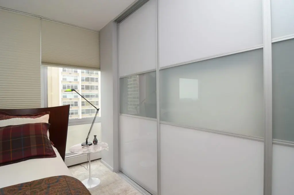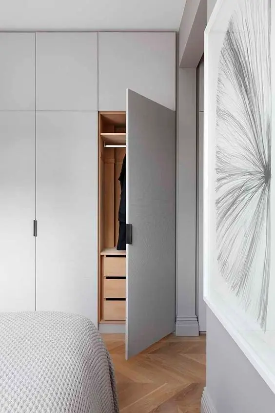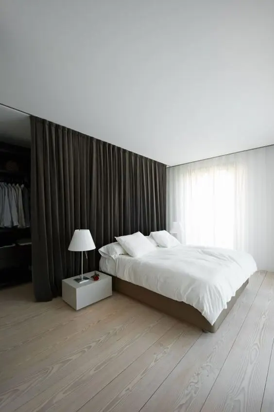 Chiar si pentru camerele cu o configuratie mai dificila, cum sunt cele lungi si inguste, exista posibilitatea instalarii unui dressing. Se poate opta pentru o delimitare cu un perete fals, o semi-incapere ce poate fi compartimentata dupa bunul plac. Pentru ca lumina naturala sa patrunda in acest spatiu nou creat, peretele despartitor poate fi unul cu o structura cu geam, asemanatoare unei ferestre (vezi modelul din galerie).